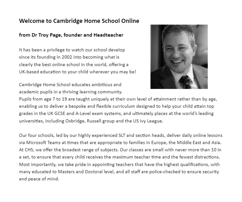 Established in 2002 (3 years before Youtube), Cambridge Home School Online was among the very first online schools in the UK. The school is one of the most trusted selective online schools across the globe. Trust is everything when choosing your child’s school! A school is more than a nice website! 90% of online schools have sprung up since the Covid 19 pandemic and do not have a track record of success. Parents should be very careful about entrusting their child’s education to start-up schools. Cambridge Home School Online boasts: